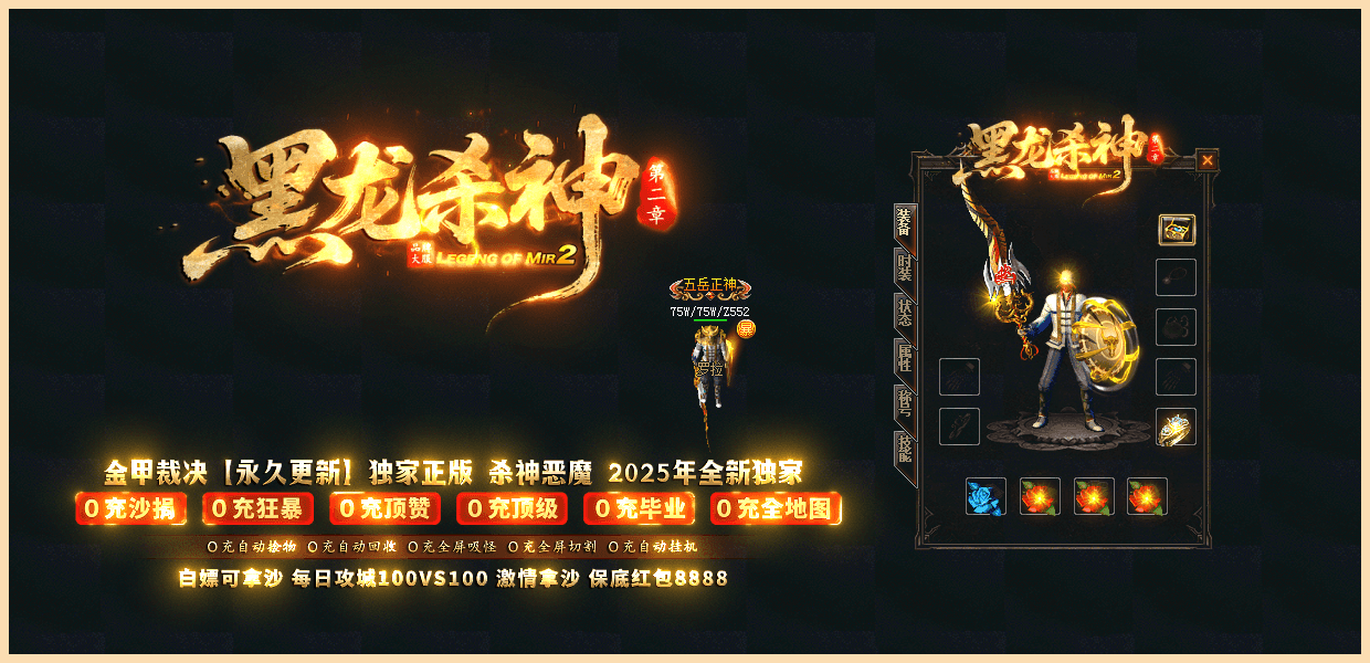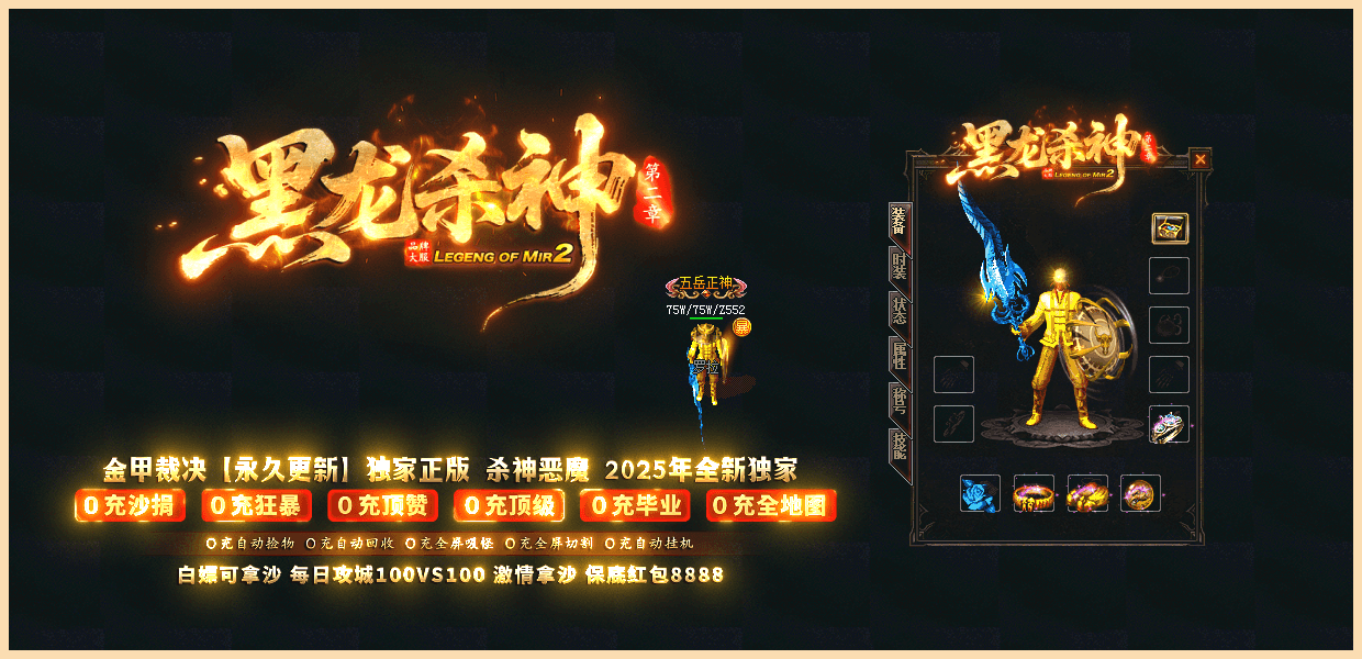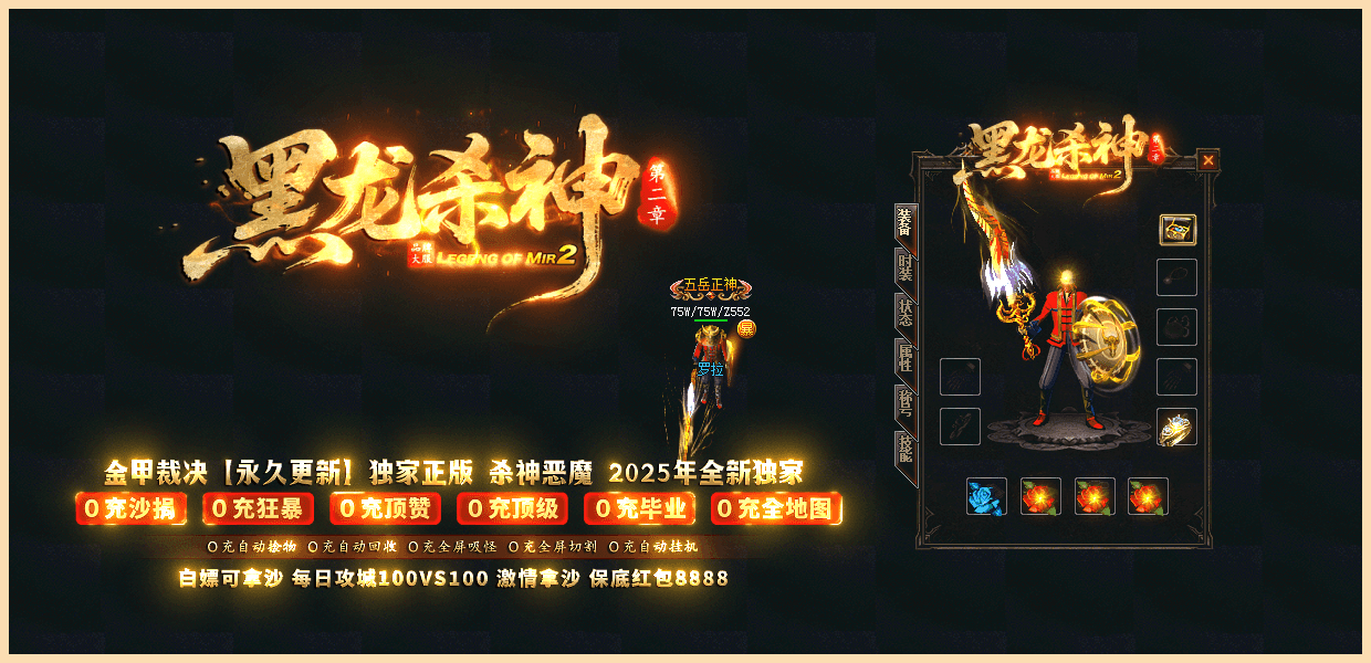 ★黑龙杀神★:已经稳定开放半年,10倍充值,百倍爆率,千倍激情,万人拿沙,所有装备靠打,白嫖永远不死!
